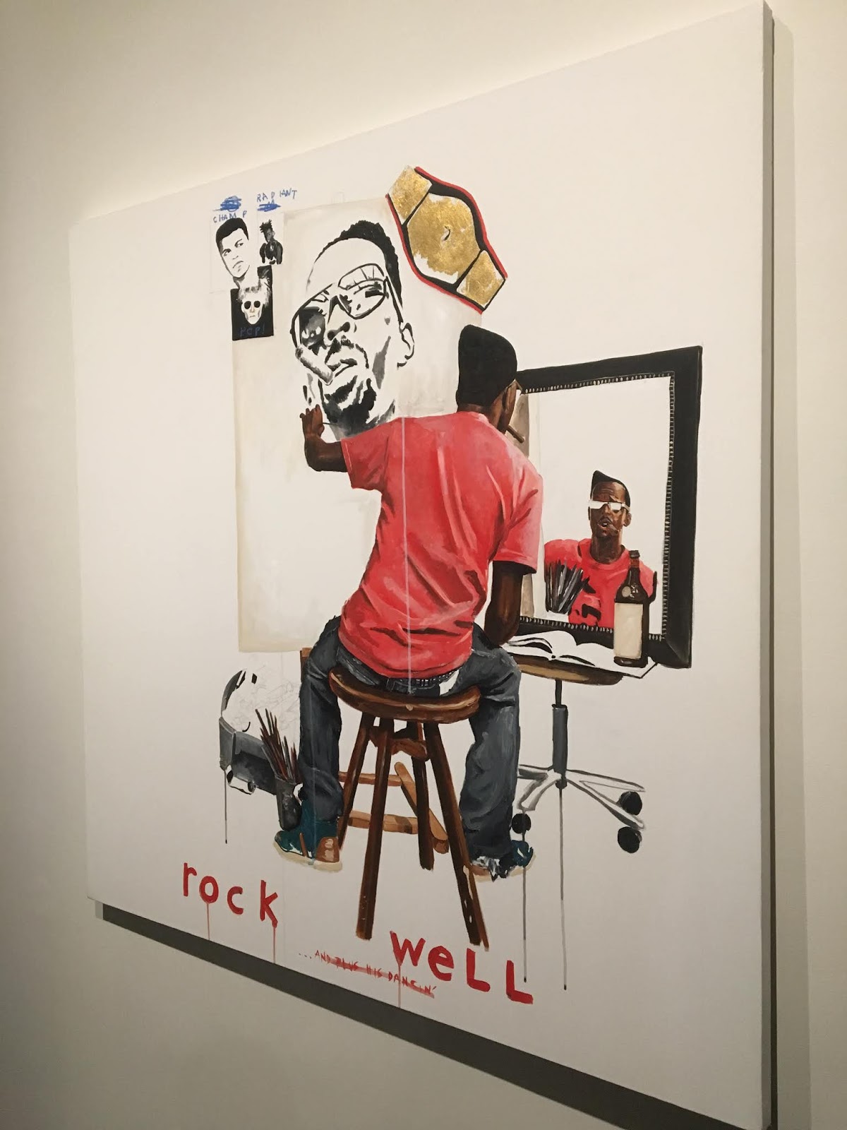 The third artwork that attracted me was Fahamu Pecou’s Rock.Well: Radiant, Pop, Champ. What was interesting in this artwork was that it was a reference to a previous artwork, Norman Rockwell’s Triple Self Portrait. The original piece featured Rockwell’s three most influential things in his life. Pecou’s take on Rockwell’s piece features his influences such as Michel Basquiat, Andy Warhol, and Muhammad Ali. This creates a self-portrait, but this one is unlike Matar Mbaye as this is more directly about the self instead of being illustrated through a muse. Overall, the identity that is constructed in this work is through Pecou’s influences and how he wants to portray himself to the public.